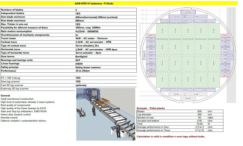 Myynti / TarjousPuutyökoneet > Kaksoissahanterä kulmasahaValmistaja ja tyyppi : ADS-630,Drekos made s.r.o Tila : Uusi tuote Syöte : 50 kW Muunnos : Kaksiteräinen saha Sahanterän läpimitta : 400, 450, 500, 550, 600, Muuta mm Tukin läpimitta (min-maks) : 200 - 1500 mm Tukin pituus (min-maks) : 2500 - 18000 mm Puutavaran suurin koko : 240 x 240 mm Valmistusvuosi : 2025