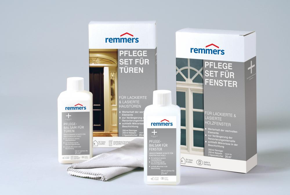 Na vyčistenie a ošetrenie drevených povrchov okien a dverí slúži špeciálne upravená a jemná ošetrujúca sada na okná a dvere Remmers Pflege-Set.